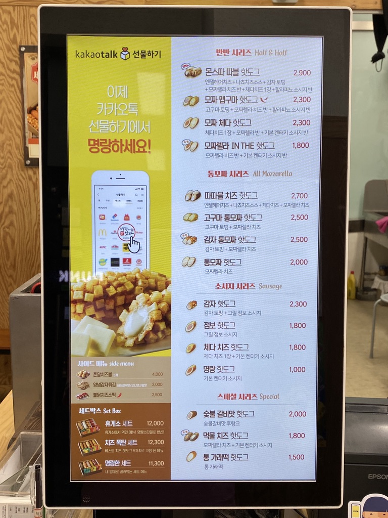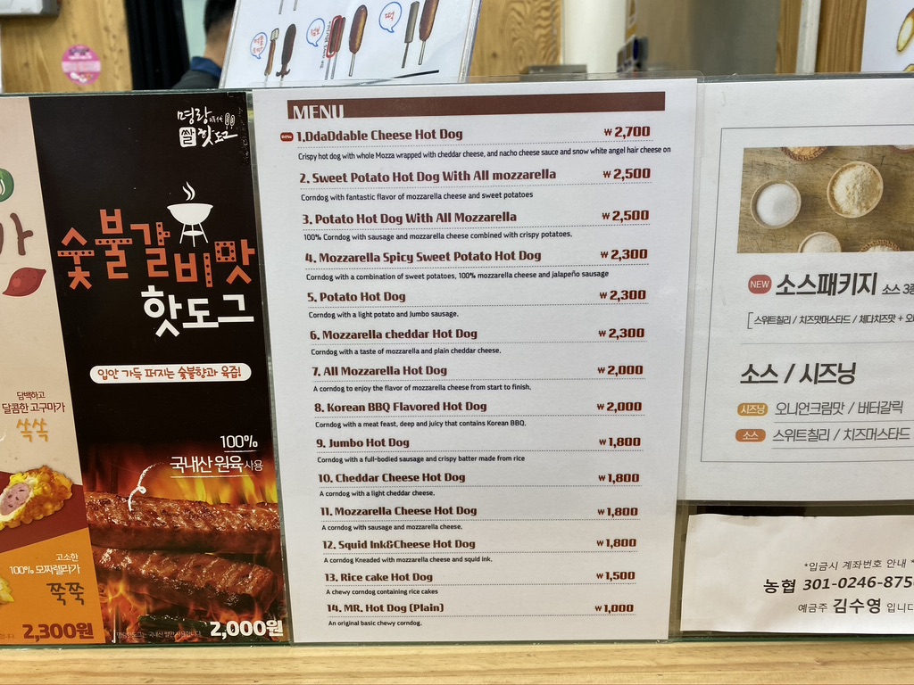 You can find various kinds of hot dog menus at Myungrang Hot Dog. There are Original Hot Dog, Mozzarella & Sausage Hot Dog, Cheddar & Sausage Hot Dog, Premium Hot Dog, Squid-ink Hot Dog, Potato Hot Dog, All Mozzarella Hot Dog, Mozzarella Cheddar, Rice Cake Hot Dog, Potato Mozzarella and others in their menu. You can also refer to the English menu in the photos below for more details.