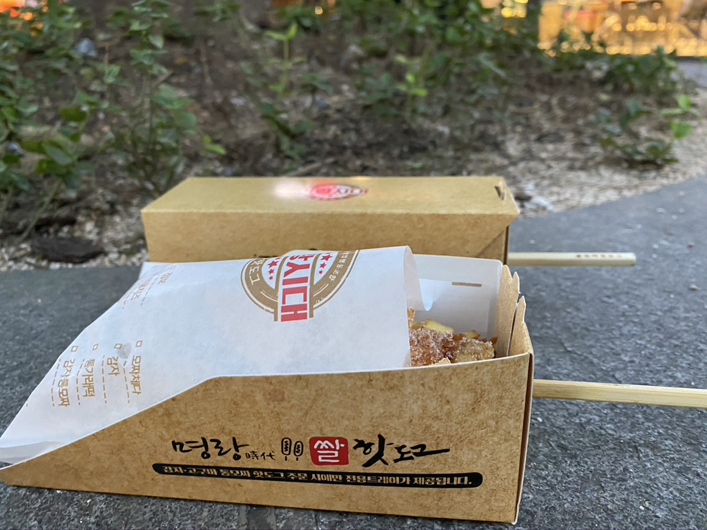 Generally, Korean-style hot dogs are very popular street food in Korea. Sausages are skewered onto sticks, wrapped in a dough and coated in sugar. As this street food is very popular in Korea, Myungrang Hot Dog gained its popularity with its specialty in Korean-style hot dogs.