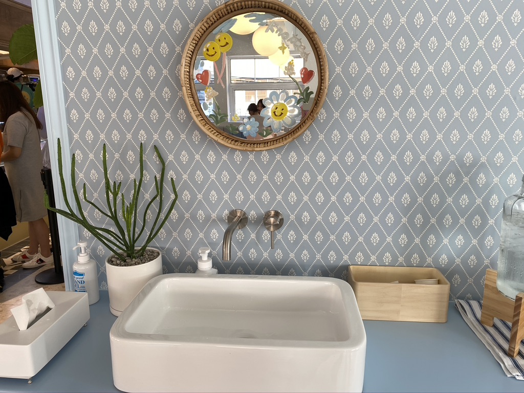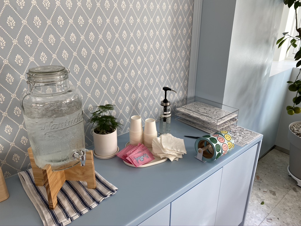 There is an area for washing hands and a place where you can find a wet tissue, napkins, water and adorable smile stickers.