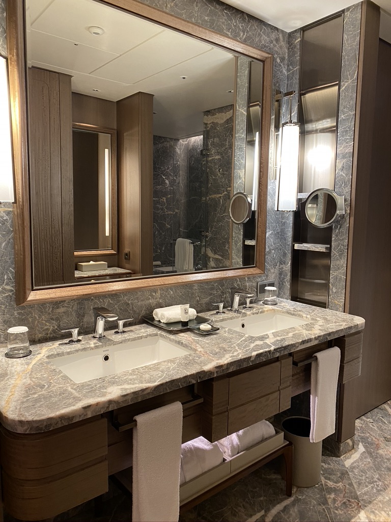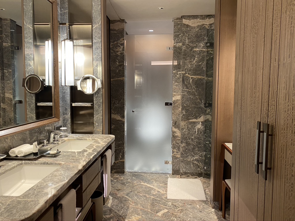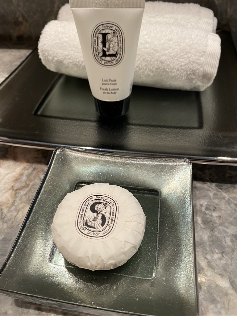 There is a spacious bathroom in the room and you will be impressed with the amenities in the bathroom. There are Diptyque (luxe French brand) shampoos, conditioners, body wash, soap and body lotion.