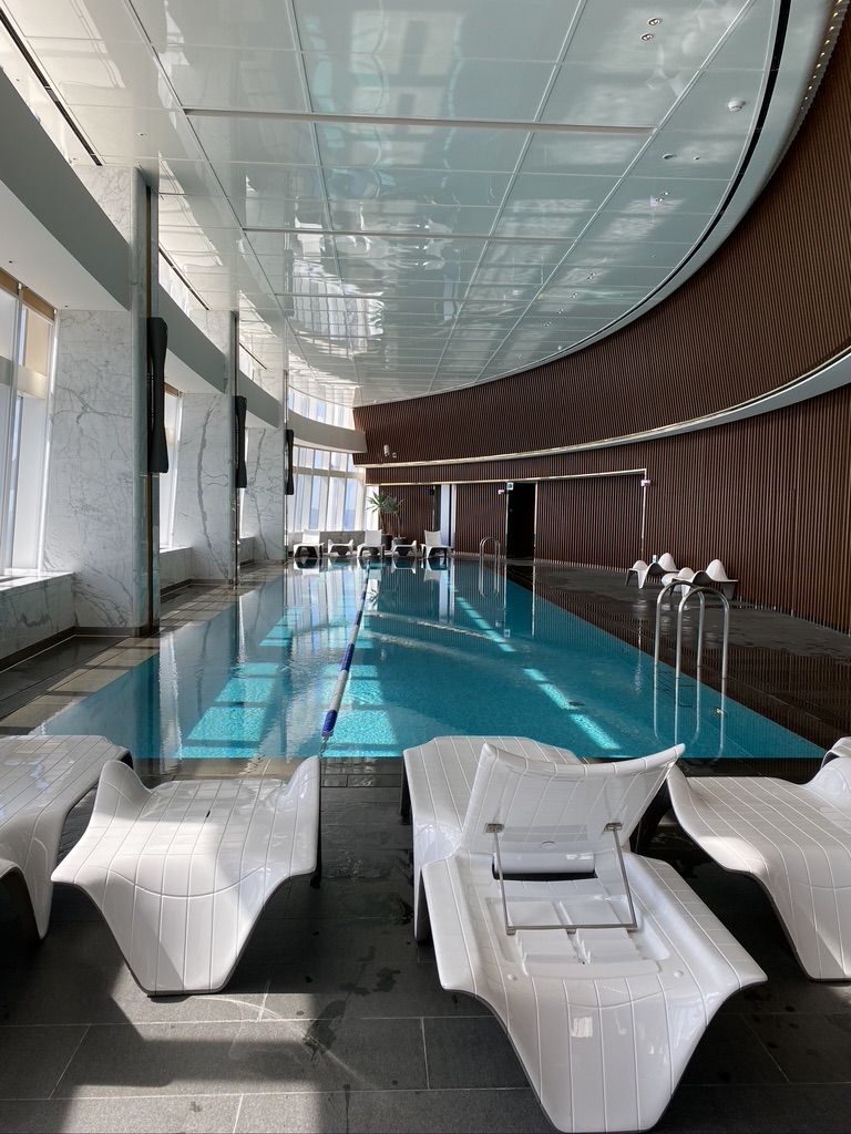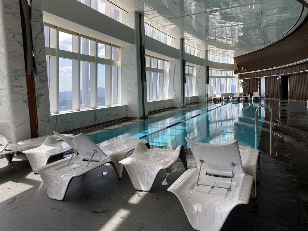 There is an indoor swimming pool with wide oversized window that you can admire a gorgeous city landscape.