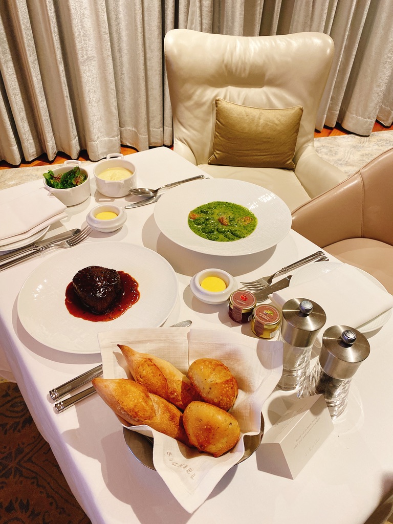 Room-dining services are also available so you may find a menu and order your favorite dish and enjoy the room-dining. The photo below shows a Beef fillet, Creamy Black Pepper Sauce (Hanwoo 1++) with Soft Mashed Potatoes and Green Salad and Potato Gnocchi with Pesto and Tomatoes.