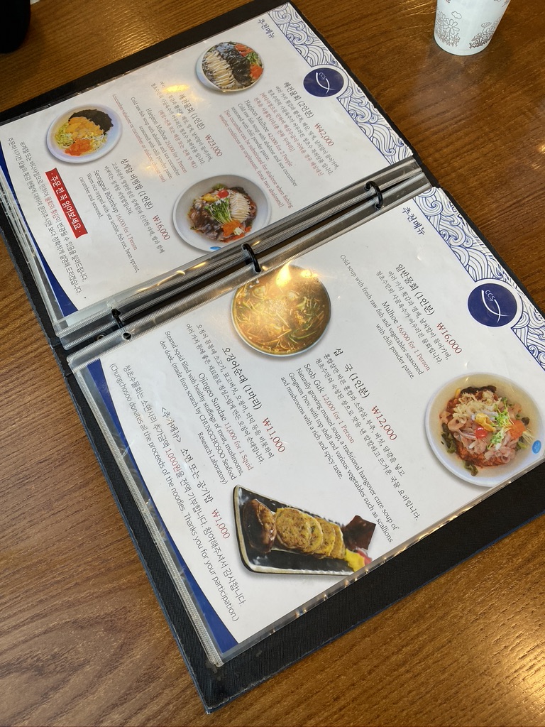 At Chungchosoo Mulhoe, you can find menus of Haejeon Mulhoe for 2 persons and 1 person. Also you can find other menus of Seonggeal Bibimbap, General Mulhoe, Seob Guk and Ojingeo Sundae.