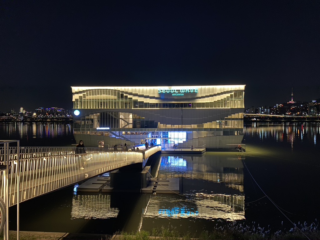 "Seoul Wave Art Center (서울 웨이브 아트센터 in Korean)" is a floating center for art galleries and events on Han River. You may find this exhibition venue floating on Han River while walking along the Han River park in Jamwon-dong.