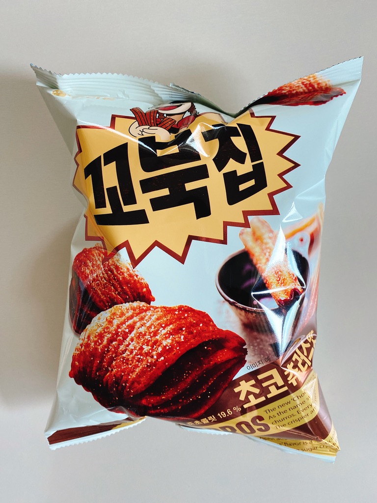 Today, we are going to show you one of the most popular flavors of Ggobuk chip. It is a "Ggobuk chip choco churros flavor (꼬북칩 초코츄러스맛 in Korean)".