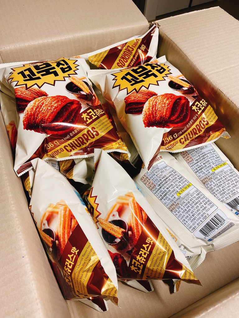 Today, we are going to show you one of the most popular flavors of Ggobuk chip. It is a "Ggobuk chip choco churros flavor (꼬북칩 초코츄러스맛 in Korean)".