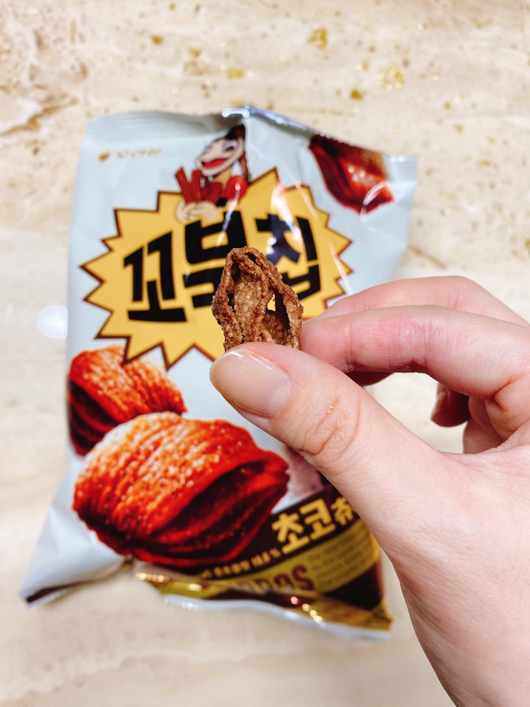 The chip looks like as other Ggobuk chips having four-layers and it has a chocolate color. The flavor of this chip is a real chocolate churros flavor.