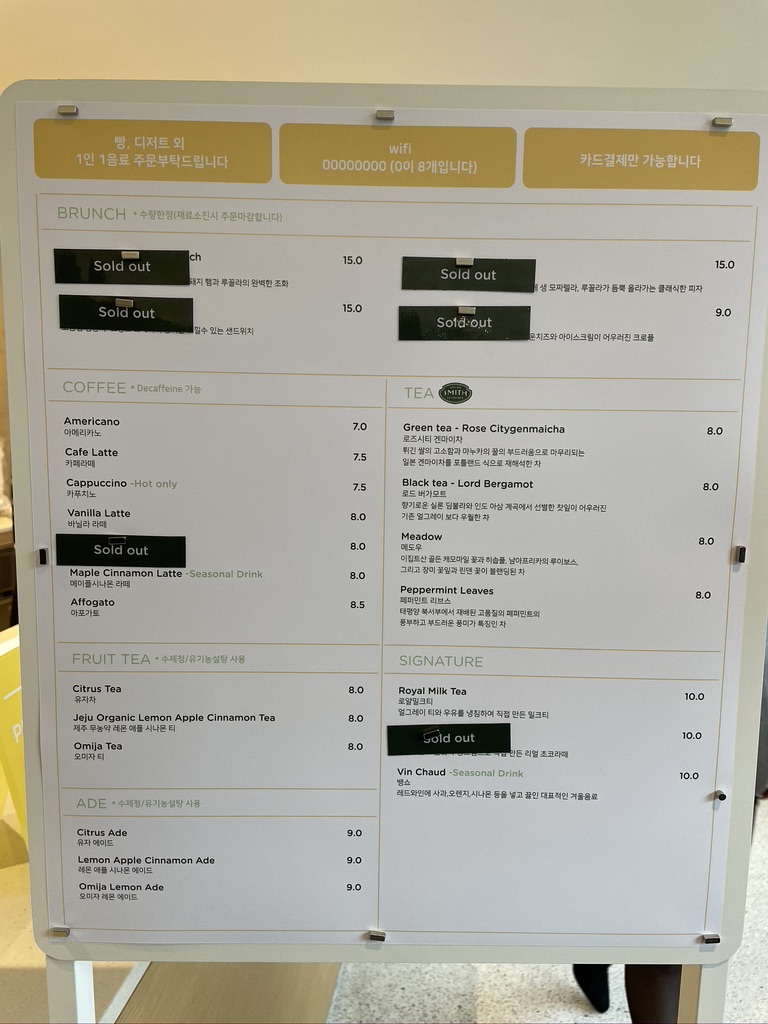 There are coffee menus of Americano, Cafe Latte, Cappuccino, Vanilla Latte, Maple Cinnamon Latte and Affogato. You can also find non-coffee drinks of fruit tea menus that are Citrus Tea, Jeju Organic Lemon Apple Cinnamon Tea and Omija Tea and other tea menus that are Green Tea - Rose Citygenmaicha, Black Tea - Lord Bergamot, Meadow and Peppermint Leaves. You can also find ade menus that are Citrus Ade, Lemon Apple Cinnamon Ade and Omija Lemon Ade. Additionally, there are signature menus of Royal Milk Tea and Vin Chaud at Cafe Moani.
