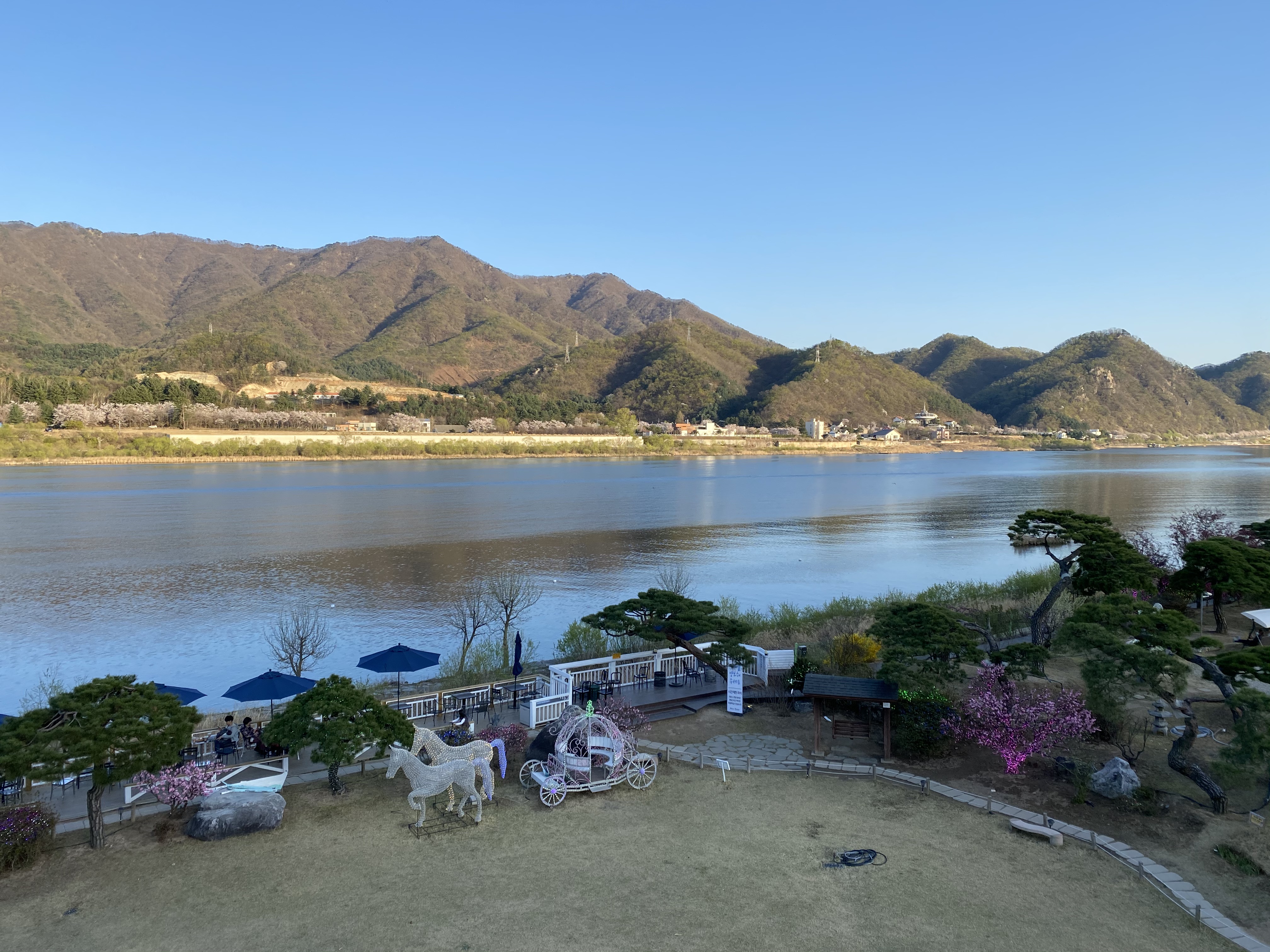 You can enjoy a beautiful Northern Han river view both inside and outside the cafeteria. Inside the cafeteria, you can enjoy a nice view as there is a large window so if you feel a bit freezing or too hot outside you can stay inside the cafe and enjoy the view with a cup of coffee and bread. Also, there is a large garden outside the cafeteria so you can enjoy a nice Northern Han river view with its breeze.
